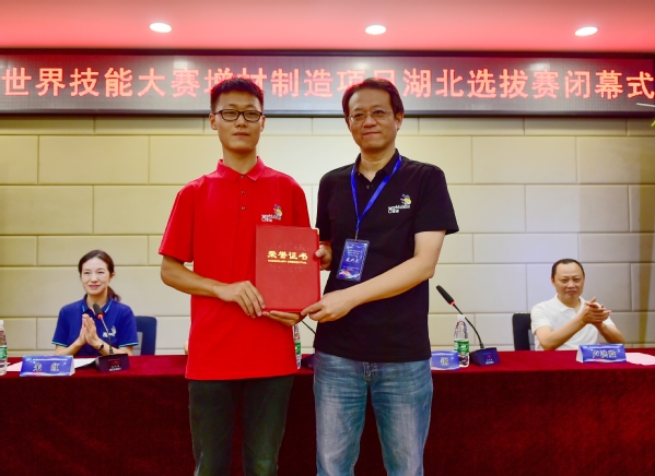 第46届世界技能大赛增材制造项目湖北省选拔赛裁判长周钢为一等奖获得者颁奖